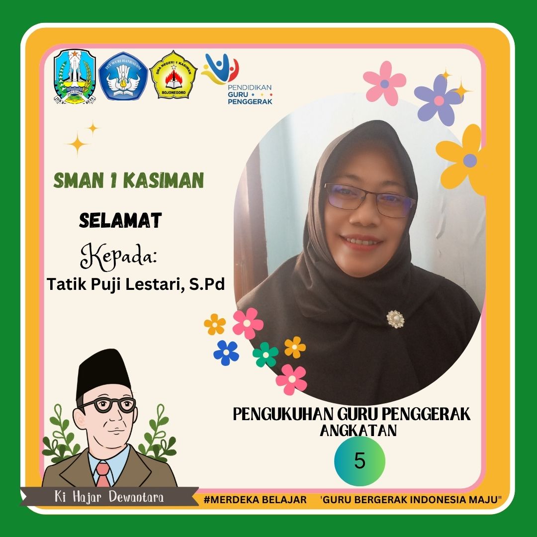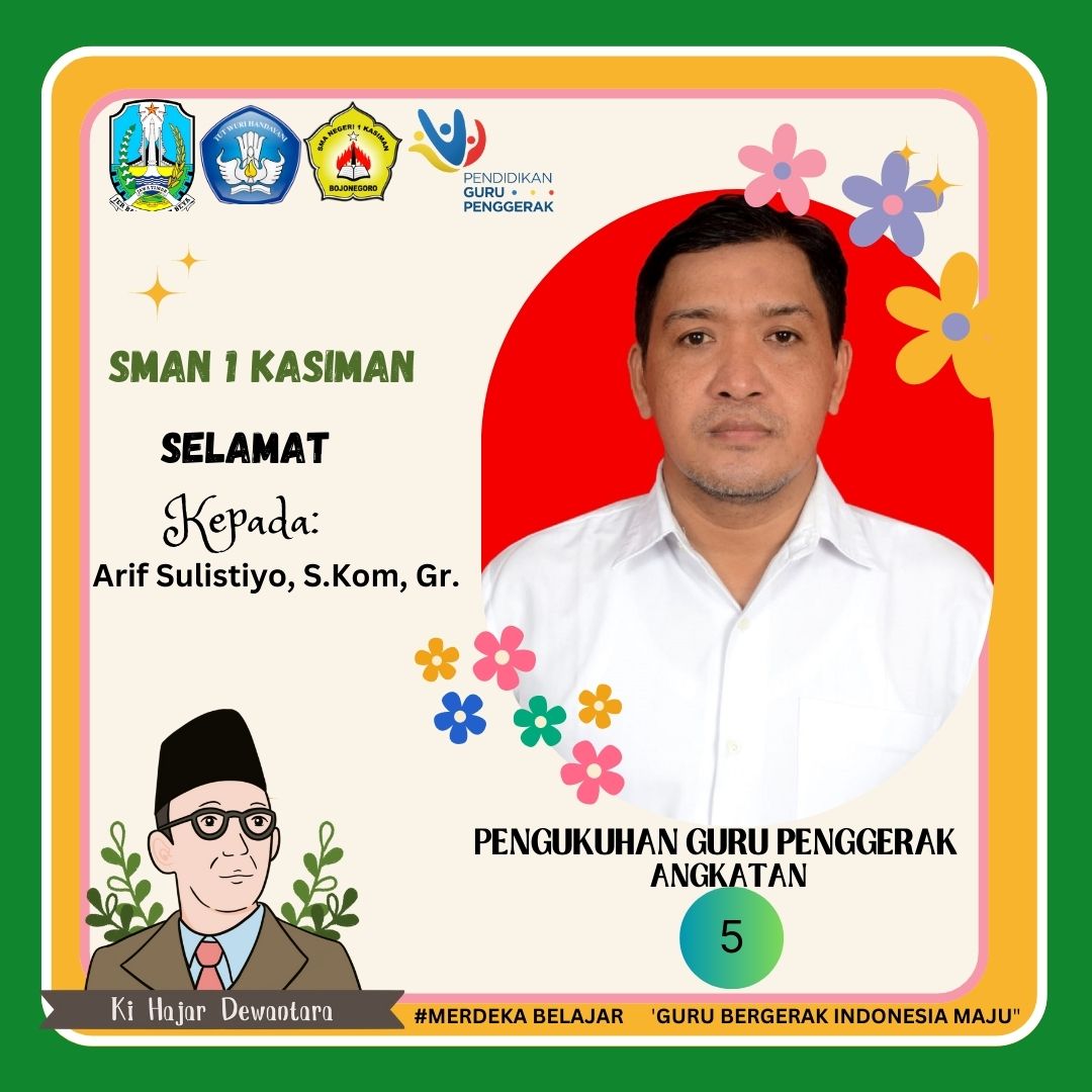 Rabu, 10 Mei 2023. Menjadi momen berharga bagi dua guru inspiratif SMAN 1 Kasiman, Ibu Tatik Puji Lestari, S.Pd dan Bapak Arif Sulistiyo, S.Kom, Gr. Beliau Berdua mengikuti pengukuhan sebagai guru penggerak Angkatan 5 yang berlokasi di SMT Negeri Bojonegoro dan resmi menyandang gelar sebagai Guru Penggerak (GP).