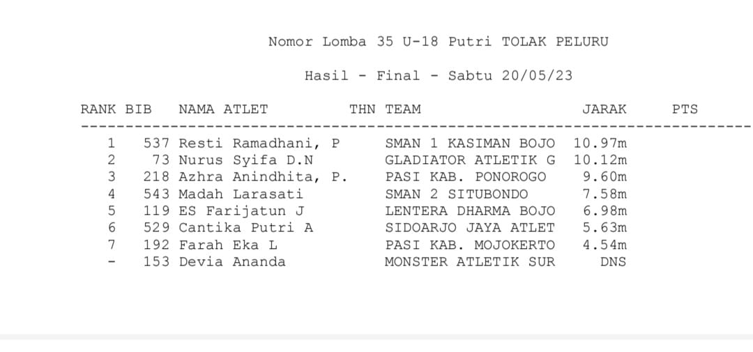 Dengan hasil jarak tersebut Resti Ramadhani mengalahkan peserta lain dari sekolah di seluruh jawa timur dan organisasi olah raga lainnya yang mengikuti lomba atletik ini khususnya pada cabang tolak peluru sehingga mengantarkan Resti Ramadhani menjadi Juara 1 utk Cabang olah raga Tolak Peluru Putri .